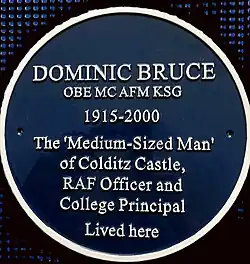 Dominic Bruce, OBE, MC, AFM, KSG (7 June 1915 – 12 February 2000) was a British Royal Air Force officer, known as the "Medium Sized Man."[3][4] He has been described as "the most ingenious escaper" of the Second World War.[5] He made seventeen attempts at escaping from POW camps, including several attempts to escape from Colditz Castle, a castle that housed prisoners of war "deemed incorrigible". He was named by Jim Rogers ("Tunnelling into Colditz") as one of the ten 'Kings of Colditz', the men who "dedicated their waking hours only to the idea of escaping".