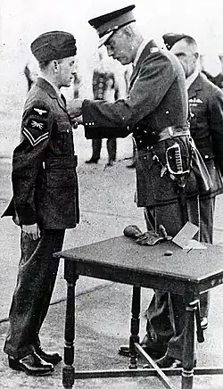 On 6 October 1938, while with No. 214 Squadron, he survived the crash of Harrow "K6991" at Pontefract, Yorkshire.[16] While acting as a wireless operator for his aircraft, he was knocked out by a lightning strike.[17] Once recovered, he alerted his base to the fact that the crew were bailing out. Wishing to get out of an escape hatch, he found his way blocked by other airmen who were hesitating about throwing themselves out of the aircraft into the howling darkness. He rushed to the other side of the hatch and jumped. His parachute harness caught on projecting clamps and pulled the trapdoor shut above him. Bruce was now suspended under the bomber and unable to escape further. Realising what had happened, his fellow crew members were now galvanised into action, raised the trapdoor and were shocked to have Bruce shoot back into the aircraft, though not too shocked to eject him again. Bruce was subsequently awarded the Air Force Medal (AFM) on 8 June 1939.[18][note 2] According to Pete Tunstall, Bruce was very proud of being the only man known to have bailed from an aircraft three times and to have landed only twice.[20] After the war he used to entertain his children with the seemingly insoluble riddle: "How is it that I baled out three times, but only landed twice?" Bruce called his AFM medal the 'Away From Mam' medal.[17]