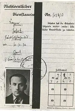 Bruce overloaded the room with inmates. The prisoners overwhelmed the officer.[35] They all chatted away whilst Bruce stole the Aktentasche.[35] This case contained papers. A demanded escaping resource and probably useful when travelling through occupied Europe.[35] Rogers also noted, the exit: Bruce shuffled out with the case, hat and gloves, hidden by the crowd.[35] Rogers explained, this officer reacted to this theft. An Appell was called and the guards lost their composure.[35] Threats were made. Rogers had never seen promises of reprisals at that level.[35]