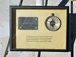 The perforated German Government copper identity tag issued to Bruce at Spangenberg (on his death it would have been broken in half); and the compass he used after escaping from Colditz to find his way through Germany to freedom.