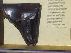 As a POW, Bruce would go on to spend eight months inside solitary confinement, mainly as a result of his escaping activities.[29] Eggers knowing Bruce was a regular in the solitary cells, would explain to Bruce, upon each arrival to the cells that as Bruce already knew the rules, he would not read out the rules... Bruce in turn would always try to bait Eggers after this response, by always reasserting with humour, 'that if he did not read him out the rules..., he would do something to break rule 1..., and then break rule 2...; and break rule 3,' and so on...[30] Under the Geneva Convention prisoners in solitary confinement were given a welcomed, one hour's exercise time. Eggers also used the exercise time to exercise his pet dog with the prisoners; this was welcomed by Bruce.[30] Eggers in turn was noted by some prisoners as very controlled and fair when compared to a few other guards in the chain of command[30] who advocated for corpses in the yard.[31] Bruce explained Eggers as 'a man who could not be bribed,'[30] Bruce's comrade, Tunstall, in contrast, wrote that though Eggers was believed to be an anti-Nazi, he was a man whom he and others could not trust, a man who was prejudiced after reading the exaggerated crime sheets, concocted by Rademacher, that got rid of Bruce and him to Colditz.[32] Eggers was thought of as very composed and a tough guard to goon bait.[30]