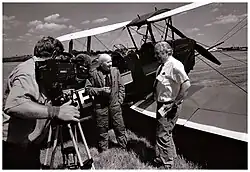 Bruce (middle, in flying suit and Caterpillar Club tie, glass in hand, aged 80) being interviewed by a SKY TV reporter, at RAF Fairford during the RAF 50th Anniversary Victory Airshow in 1995, where he was chosen to represent RAF veterans of 1935.