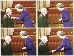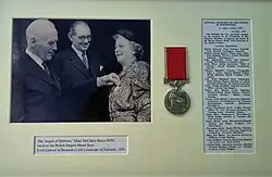 Mary McClurry Bruce (Bruce's mother) called 'The Angel of Hebburn' for her charity work amongst young mothers, receives the British Empire Medal from the trade unionist Lord Lieutenant of Durham, Lord Lawson of Beamish, a former school friend