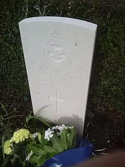 On this raid, Bruce was part of another scratch crew.[9] The crew included: Bruce, Wing Commander pilot Roy Arnold, air-gunner Flying Officer Thomas Albert Bax, air-gunner Sgt. R. H. Barratt who was also from staff, Sgt. James Murray Pinkham and Sgt. Harold Arthur Wink. Arnold stayed at the controls of the burning Wellington, at low height, in order to keep it steady and allow the other five crew members to escape.[45] He was thirty years old and married. Arnold is buried in the CWG cemetery at Blankenberge, Belgium.[47] The story of his act of self-sacrifice did not emerge until after the war when the crew returned from captivity and could tell their squadron commander. Arnold's bravery was mentioned in dispatches.[47]