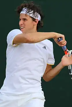 At the beginning of the grass court season, Thiem reached the second round of the Halle Open, losing to Robin Haase.[86] Then, in the second round of the Antalya Open, he was upset by qualifier Ramkumar Ramanathan, then ranked 222 in the world.[87] At Wimbledon, he reached the fourth round for the first time in his career, losing out to eventual semifinalist Tomáš Berdych in five sets.[88] Thiem then participated in the Washington Open, where he lost to Kevin Anderson in the third round.[89] At the Canadian Open in Montreal, he received a bye into the second round, but lost to Diego Schwartzman.[90] He then reached the quarterfinals of Cincinnati, where he lost to David Ferrer.[91] At the US Open, Thiem made it to the fourth round against 2009 US Open champion Juan Martín del Potro, he eventually lost in five sets, after failing to capitalize on two match points in the fourth set.[92] Thiem again struggled with form following the US Open, losing three straight matches in Chengdu, Tokyo and Shanghai.[93][94][95] Nonetheless, he qualified for the ATP Finals for the second straight year. Thiem then lost his second match in both Vienna and Paris to Richard Gasquet and Fernando Verdasco successively.[96] Thiem broke into the top five in the rankings for the first time in his career, rising to world No. 4. During the round robin stage of the ATP Finals, Thiem defeated Pablo Carreño Busta in three sets, but lost to David Goffin and Grigor Dimitrov. He did not advance to the semifinals.[97]