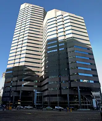Dominion Towers is an office complex in Denver, Colorado. It consists of two adjoining towers, and was built in 1982. The taller one, Dominion Towers South, is 384 feet (117 m) tall and has 28 floors. The buildings have pink granite facades and blue-tinted windows.