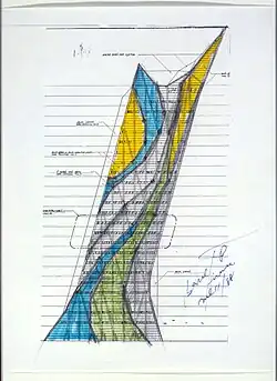 Birkerts designed a second concept for a skyscraper, which was nicknamed the "Leaning Tower of Pizza" by the press. The 30-story structure progressed to the design phase, but was never built. The structure encountered issues during the design process, which specified a 15-degree slant. Birkerts struggled to find a way to install elevators in the building due to the structure's slant, and he felt that the design counteracted some of the Wright-inspired components of the Prairie House. Monaghan commissioned a scale model of the design to be built at Domino's Farms, which still stands in 2025.[21]