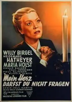 Don't Ask My Heart (German: Mein Herz darfst du nicht fragen) is a 1952 West German drama film directed by Paul Martin and starring Willy Birgel, Heidemarie Hatheyer and Maria Holst.[1] It was shot at the Tempelhof Studios in West Berlin. The film's sets were designed by the art directors Hans Jürgen Kiebach and Gabriel Pellon