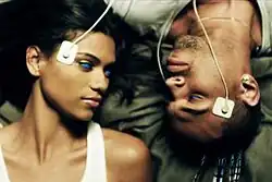 A screenshot of the music video, featuring Brown and the woman lying in bed with electrodes attached to their heads.