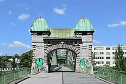 The Donaukanal bifurcates from the main river at the Nußdorf weir and lock complex, in Döbling, and joins it again just upstream of the "Praterspitz", at the Prater park in Simmering. The island thus formed between the Donaukanal and the Danube holds two of the 23 districts of Vienna: Brigittenau (20th District) and Leopoldstadt (2nd District). The canal is crossed by fifteen road bridges and five rail bridges.[1]