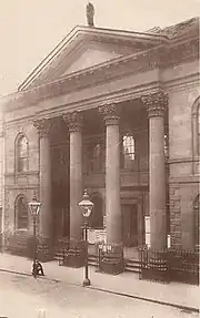 In 1846 the civic leaders decided to demolish the old town hall and to erect a new guildhall:[4] the site they selected for the new building, in Frenchgate, was occupied by a public house, the Angel Inn.[5] The new structure was designed by John Butterfield, also in the neoclassical style, built in ashlar stone and was completed in 1848.[6] The design involved a symmetrical main frontage with five bays facing onto Frenchgate; the central section of three bays, which slightly projected forward, featured a tetrastyle portico with Corinthian order columns supporting an entablature and a modillioned pediment.[6] Although it was a Grade II listed building, it was demolished by Doncaster Council in 1969 to make way for an extension to a Marks & Spencer shop.[6]