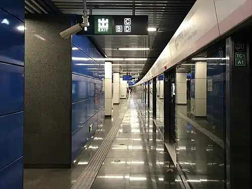 The station has an underground island platform. It is situated on a section of a 1000-metre-radius curve.
