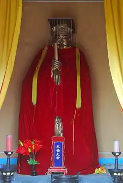Emperor Dongyue (or Chinese: 東嶽大帝; pinyin: Dongyue Dadi; lit. 'The Great Emperor of the Eastern Peak') is a Daoist deity of the sacred mountain Mount Tai.[1] He is also believed to be the leader of a large bureaucratic celestial ministry overseeing the maintenance of the Book of Life (生死簿), a register of the due dates on which each and every human soul must be summoned before the Judges of Hell for judgement.[2] Dongyue Dadi is also considered significant in Chinese Buddhism.[3] He is the personification of Cangdi as the "Great Deity of the Eastern Peak" (东岳大帝), which is Mount Tai. As the incarnation of Mount Tai, he is the holy messenger of communication between heaven and the world, and the patron saint of the emperors of all dynasties who was ordered by the sky to govern the world.[4]
