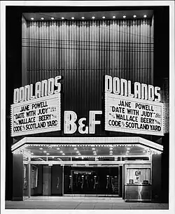 After a protracted construction that lasted more than one and a half year due to a workers' strike,[1] the Donlands Theatre opened on 20 November 1948 with a screening of the historical drama Tap Roots.[3] It operated as part of the regional Bloom and Fine chain, a Famous Players affiliate, until 1969.[4] It was favorite childhood spot of actor John Candy, who grew up in the neighborhood.[5] Some sources also mention that he worked there as an usher.[6] Writer Pierre Berton and his wife, who lived next door with their first daughter, were also regular patrons.[7] It then operated directly under the Famous Players umbrella, before being sold in 1975 amidst a reorganization of the company's assets.[8] Shortly prior to the sale, it was described as a repertory cinema, offering multiple bills in quick rotation.[9]