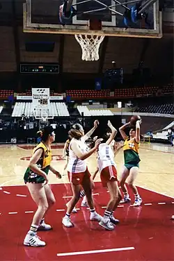 ![]() Annette Kelly (L) watches as Donna Burns shoots when the Australian "Pearls" play Great Britain at the 1992 "Paralympic Games for Persons with Mental Handicap" in Madrid. | ||||||||||||