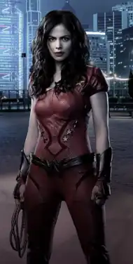 The build-up to Donna's recruitment begins when she volunteers to help Mikaal Tomas and Congorilla track down the supervillain Prometheus. She accompanies them to the JLA Watchtower alongside Starfire and Animal Man, only to discover that Red Arrow has been mutilated by Prometheus.[44] During the ensuing battle, Donna is impaled through the wrists, but frees herself. Prometheus projects a hologram around her, causing Green Arrow to shoot her in the leg, which penetrates her skin and causes her to fall unconscious. She takes down Prometheus after he defeats the rest of the team, rips off his helmet, and starts beating him brutally, but Shade stops her. Unfortunately, the villain destroys Star City via a teleportation device.[45]
