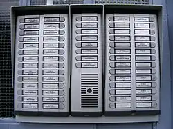 A door phone in its most basic version is a two-way intercom allowing communication from the street to the inside of a building. More complex door phones are connected to electric strikes, and can unlock and open the door to allow access to the interior of the building.[1]