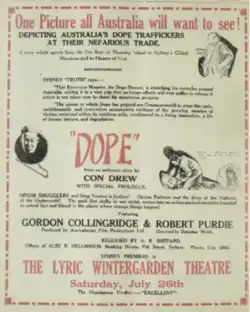 Dope is a 1924 Australian silent film about a respected citizen who is blackmailed by someone from his past. It is considered a lost film.[3]