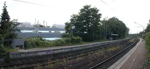 Dortmund West station is a railway station in the Dortmund district of Marten in the German state of North Rhine-Westphalia. It is classified by Deutsche Bahn as a category 6 station.[1] It was opened on 3 June 1984[4] on the Osterath–Dortmund Süd railway completed between the old Dortmund-Dorstfeld station and the old Dortmund Süd (south) station by the Rhenish Railway Company on 19 November 1874 and electrified on 25 May 1984.[5] It is proposed to build platforms on the Elberfeld–Dortmund railway to provide interchange with S-Bahn line S 5.