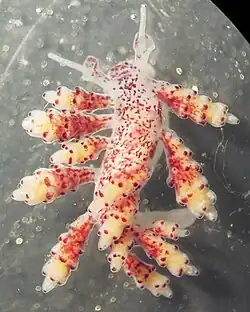 Before 1976 a number of species were called by the name Doto coronata and the process of splitting this complex into species was started by Henning Lemche.[2] Species with translucent white bodies and red or black spots on the cerata which were formerly identified as Doto coronata include: