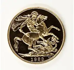 The Royal Mint realised there was a market for sovereign coins, and began to sell them to collectors at well over face or bullion value.[35] Since 1980, the double sovereign has been issued in most years. Coins from 1980 to 1983 (none were issued in 1981 or 1984) used the Arnold Machin effigy of Elizabeth, while the 1985–1996 coins used the Raphael Maklouf effigy and coins from 1998 to 2015 use the Ian Rank-Broadley effigy, mostly paired with Pistrucci's reverse, which was restored in 2009 to show additional detail of the dragon.[36] No double sovereigns were issued in 1986, 1994, 1995, 1997, 1999 or 2001, years in which the coin's place in the gold proof set was taken by a gold version of a commemorative £2 piece issued that year. In 1989, the usual designs were replaced with a commemorative evoking the design of the original English sovereign of 1489, by Bernard Sindall.[37][38]
