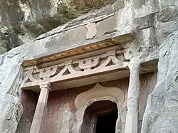 Dougong is part of the network of wooden supports essential to the timber-frame structure of traditional Chinese building. Dougong serve as a connection between the vertical columns and horizontal beams of a structure, capturing the weight of a larger surface area of each beam and transferring it vertically through the column.[2] It is characterized by layers of interlocking bracket sets, formed by placing a large wooden block (dou) on a column to provide a base for the bow-shaped brackets (gong) which in turn support either the horizontal structural beam or another bracket above. The wooden joinery is one of the earliest examples of modern mortise and tenon joints,[3][4] using precisely cut notches and grooves to allow for a tight fit.