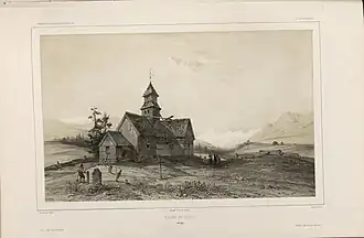 The first church in Dovre was a wooden stave church that was likely built around the year 1250. Oral tradition said that King Haakon Haakonsen had the small church built there. The farm area on which it was built was a royal farm that was mentioned in old writings by the historian Snorri Sturluson who wrote that King Harald Hårfagre had a Christmas party at this site. The church was located about 1.7 kilometres (1.1 mi) north of the present church site.[3][4]