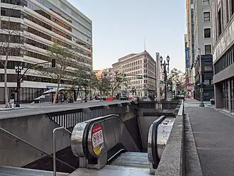 Three subway Bay Area Rapid Transit stations serve downtown: 12th Street Oakland City Center station, located at 1245 Broadway, and 19th Street Oakland station, located at 1900 Broadway, are both located on the Broadway subway corridor. The Lake Merritt station is in the eastern area of Chinatown, at 800 Madison Street. All of BART's main services travel through the Oakland Wye, an underground flying wye.