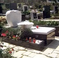 Ričl's grave at Bare Cemetery with apple-shaped tombstone, in reference to the name of his band Crvena Jabuka (Red Apple)