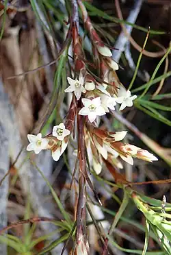 Flowering occurs from January through to March, producing 3–9 white flowers on each 13–28 mm (0.51–1.10 in) long rectangular raceme. The flowers themselves are made up of 4–6 by 1.5–3.0 mm (0.16–0.24 by 0.06–0.12 in) green sepals which enclose a 5.5–6.5 by 2.0–2.5 white hairless corolla. In the upper third of the corolla tube is the stamen, which is made up of a 0.1 mm long light yellow anther suspended off of a 0.5 mm long filament. In order to provide an incentive for pollination D. ophioliticum has 1.0–1.2 by 0.6–0.7 mm rectangular nectary scales.[2][3]