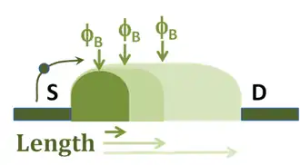 As channel length decreases, the barrier φB to be surmounted by an electron from the source on its way to the drain reduces