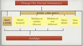 Dravya (Sanskrit: द्रव्य) means substance or entity. According to the Jain philosophy, the universe is made up of six eternal substances: sentient beings or souls (jīva), non-sentient substance or matter (pudgala), principle of motion (dharma), the principle of rest (adharma), space (ākāśa) and time (kāla).[1][2] The latter five are united as the ajiva (the non-living). As per the Sanskrit etymology, dravya means substances or entity, but it may also mean real or fundamental categories.[2]