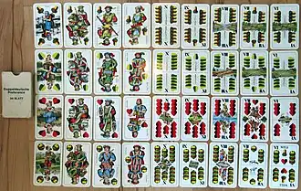 The game is played with a Schnapsen pack (Schnapskarten) of 20 cards. In French packs the 4 suits are: Hearts (Herz), Diamonds (Karo), Spades (Pik) and Clubs (Kreuz or, regionally, Treff). In William Tell (doppeldeutsche) packs, German suits are used: Bells (Schelle), Leaves (Blatt, Grün or Laub), Hearts and Acorns (Eichel).
