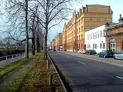In 1894, the railway administration opened a partially contiguous railway settlement in the immediate vicinity of the station. These included five buildings on the Weißeritz at 54 to 72 Emerich-Ambros-Ufer as well as several houses on Flügelweg. These clinker brick buildings have been preserved to this day.[9] To the south of the marshalling yard, the Saxon State Railways also had a large rail workshop, which opened in November 1894, and a railway depot, which was opened at the same time as the station.