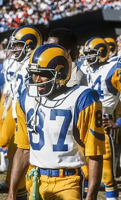 Hill was drafted in the 12th round by the Los Angeles Rams in 1979 as the 328th pick of 330 players.[6] He was utilized for kick returns in most of the games with occasional time at receiver. Against the Seattle Seahawks, he caught his first passes as a receiver (two) along with scoring his first touchdown. In total, he returned fourteen kicks for 803 yards.[7] Hill saw limited action in the postseason for the Rams that year, which saw them advance all the way to Super Bowl XIV. He caught one pass for 28 yards in the Super Bowl against the Pittsburgh Steelers. It was his only Super Bowl appearance, which the Rams lost 31–19.[8] Hill was used selectively again in 1980, catching 19 passes for 416 yards with two touchdowns while returning 43 kicks for 880 yards and a touchdown (from 98 yards out), which ended up being the only kick return touchdown of his career. He caught a total of 23 passes in the next two combined seasons for the Rams (while having more returns, most notably returning 60 for 1,170 yards in 1981) before missing the entire 1983 season due to injury; when he returned, he returned 26 kicks for 543 yards while catching 14 passes for 390 yards. In 1985, he was traded to the Houston Oilers for draft picks after the emergence of receivers such as Henry Ellard.