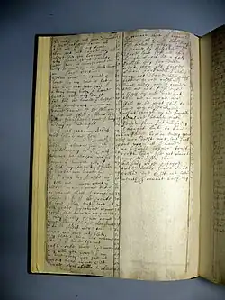 The manuscript appears to be the work of a single scribe.[8] It is not work of a professional copyist but of a secretarial hand, consistent in its use of italics.[1] Based on the idiosyncratic natures of letters such as "e", "r" and "c," Cutts attributes an Italian influence to the scribe.[6] An unusual attribute of this scribe is that he tends to write v for u, resulting in words such as "thov" (thou). The calligraphy is difficult due to many cross outs and obscuring of letters due to an unsharpened quill and smudging.[6]