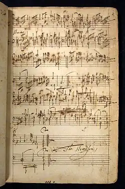It is not known how the manuscript came into the possession of Edward Francis Rimbault, although Klakowich made an educated guess that it could have been purchased from the Jones's auction by Rimbault's father, Stephen Francis Rimbault.[23] A musicologist and a voracious collector of British manuscripts, it is not surprising that the manuscript would become one of his holdings. After Rimbault's death in 1876, the manuscript was listed as lot 1394 in the 1877 auction catalog of his estate.[24][25] Purchased for £16 10s,[26] the manuscript was one of about 600 lots acquired by Philadelphia-born financier Joseph W. Drexel, who had already amassed a large music library. Upon Drexel's death, he bequeathed his music library to The Lenox Library. When the Lenox Library merged with the Astor Library to become the New York Public Library, the Drexel Collection became the basis for one of its founding units, the Music Division. Today, Drexel 5611 is part of the Drexel Collection in the Music Division, now located at the New York Public Library for the Performing Arts at Lincoln Center.
