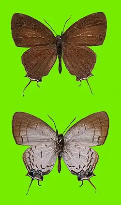 Drupadia hayashii [1] is a butterfly of the family Lycaenidae. It is found in the Philippines (Tawi Tawi-Province, Sibutu Island). Forewing length:11-15mm. It is rare and very localized Drupadia so far found only on Sibutu Island in small clearings in secondary forest. Normally they are seldom seen in flight and it is necessary to create movement amongst the bushes and lowest branches of trees in such a clearing in order to disturb these butterflies. Both the male and female are very small and have a weak flight, so it is no surprising that they seldom fly more than 3 to 5 meters before they settle on a leaf and then often crawl under it. Since most of the secondary forest on this island has either been cut down or burnt, it is possible that this species is either close to extinction or perhaps already extinct.