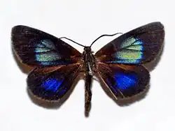 Wings of Drymoea beata can reach a length of about 33–38 millimetres (1.3–1.5 in). Upperside of the wings is deep black, with deep bright blue-green disks.[3]