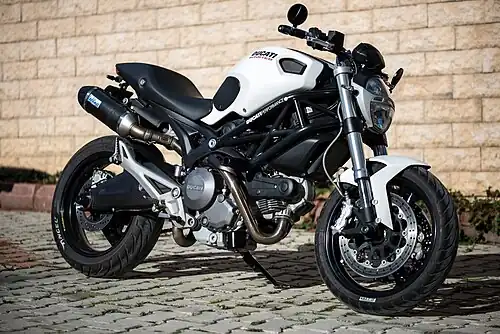 Since its launch in 1993, Ducati had sold over 200,000 Monsters, which at one time amounted to 60% of Ducati's production. The initial Monster was cheap and easy to build and has remained so during its long life.[2] Ducati's "less-is-more" rationale of the Monster range aimed to combine high performance in a compact motorcycle. Ducati recently updated the Monster range, with redesigned components to improve performance and appearance. In 2022 Will Burgess repurposed one of these to make a custom Carbon Fibre Monster 696.[3][4]