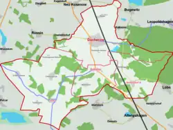 Ducherow as a municipality consists of Ducherow itself and three other former municipalities that were annexed into Ducherow. These are: Neuendorf A, Löwitz, and Rathebur. These former municipalities and Ducherow are officially subdivided into villages (Ortsteile), officially recognized are the following: Ducherow, Busow, Kurtshagen, Löwitz, Marienthal, Neuendorf A, Rathebur, Sophienhof, Schmuggerow und Schwerinsburg.[2] The municipality further includes the two non-recognized settlements Schmuggerow-Ausbau and Ducherow-Ausbau.