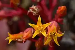 The calyx of the flowers is 3 to 7 mm long, and 2.5 to 6 mm wide. The calyx lobes (equivalent to sepals) are triangular to triangular ovate, 1.5 to 5 mm long. The corolla is cylindrical in anthesis, with the tips of the petals spreading from 45 to 90 degree angles. The petals are colored yellow, orange, or red, and may be glaucous along their midrib. The petals are shaped elliptic to narrowly lanceolate, with an acute tip, 7 to 15 mm long and 2 to 4 mm wide, connate (fused to form a tube) 1 to 2.5 mm.[1][2]