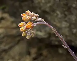 The peduncle is 10 to 30 cm tall to the cyme, 1.5 to 5mm thick, colored pink to red and often glaucous, with a variable shape depending on the subspecies. The lower 2 to 12 cm of the peduncle is bare, with 5 to 23 bracts starting above, ascending, triangular-ovate to -lanceolate, with the lower bracts 4 to 30 mm long, 3 to 12 mm wide. The cyme is commonly pinkish and glaucous, composed of 2 to 3 branches that bifurcate up to two times. The cincinni have 4 to 24 flowers, and in cultivation they open at intervals of 2 to 5 days, staying open for 5 to 6 days.[2]