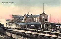 Finally, on 15 February 1870, a three kilometre long branch line was opened by the Rhenish Railway Company (Rheinische Eisenbahn-Gesellschaft, RHE) from the Rheinhausen–Hochfeld train ferry to Duisburg, which became the starting point of its new route to Quakenbrück, completed in 1879. It built a through station next to other stations in Duisburg.