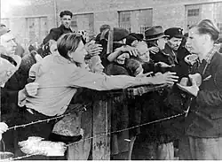 The refugees brought to the camp had to jump off the wagons amidst shouts and pushes, as there were no platforms at the Pruszków siding. Then, amidst a corridor of Germans, they were driven into one of the nine production halls. Guards were unallowed to assist the sick, injured, or elderly when disembarking from the wagons or carrying loads. Only Polish personnel recruited by the Central Welfare Council could do this, but their numbers were too few considering the size of the transports.[74] The halls where the refugees were placed were surrounded by barbed wire and supervised by German posts.[75] Leaving the halls was prohibited, so only Polish personnel could move relatively freely within the camp.[76] There were incidents where people standing too close to the fence were harassed by dogs. German agents and military patrols searched the crowd of refugees for hidden Home Army soldiers.[77]