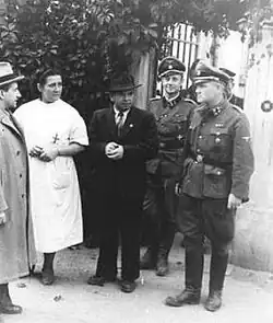 The camp's medical services were staffed by dozens of volunteer doctors and nearly 300 nurses. Lieutenant Doctor Kazimierz "Bożymir I" Szupryczyński – a railway doctor and head of the medical services of the VI District of the Home Army – directed all his medical staff and auxiliary staff of the Women's Military Service to help the displaced. Additionally, he engaged volunteers such as doctors and nurses from Pruszków.[36] According to some sources, at the peak of its operations, the medical services of Dulag 121 employed about 500 people – including 102 doctors, 122 nurses, and numerous Daughters of Charity.[31] The German authorities appointed Jadwiga Kiełbasińska, a midwife from Milanówek who spoke German fluently and enjoyed the full trust of the occupation authorities, as the head of the Polish medical staff. Kiełbasińska, illegally using the title of medical doctor, was not well-liked by the Polish staff. However, she tried to help the refugees without losing the trust of the Germans.[37] Among other things, Kiełbasińska organized a hospital in the Perełka villa in Milanówek, where many insurgents were hidden with her knowledge.[38]