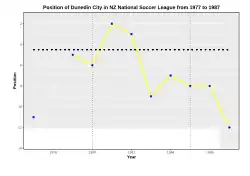 Dunedin City is a former New Zealand football club based in the South Island city of Dunedin. Dunedin City was founded in 1909 as Dunedin High School Old Boys, and changed their name to Dunedin City in 1970. The team won the Chatham Cup in 1981, and was a member of the National League in 1977[1] and 1979–87,[2] before withdrawing from the league for financial reasons.[3] The team won promotion again in 1991 but choose not to join the National League due to the travel costs.[4] The team survived until 1991 before being disbanded.[5]