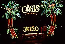 The Oasis Casino featured curved neon palm trees at its entrance, standing 70 feet with fronds 20 feet in length. They were designed by Ad-Art sign designer Jack DuBois, based on early design work by Raul Rodriguez.[211][212] The palms were dismantled in April 1993, after being sold during the liquidation sale to a buyer in Taiwan.[213] By 1999, the palms had been installed at the entrance to the NASA nightclub in Bangkok. The club closed some time after that, and the whereabouts of the palms are unknown.[211][212]