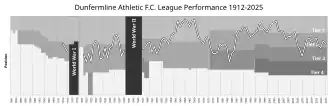 Chart of yearly table positions of Dunfermline in the Scottish League.
