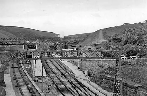 The station was opened on 14 July 1845[2] and consisted of two flanking platforms, the main, stone built structure, with booking office and staff accommodation was on the Manchester-bound (Down) platform, whilst the Sheffield-bound platform (Up) had a large water tower alongside a stone built waiting shelter. Immediately east of the station was access to sidings which served stone quarries.